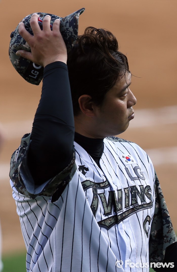(서울=포커스뉴스) 26일 서울 잠실구장에서 열린 2016 프로야구 넥센-LG 경기에서 LG 투수 류제국이 5회 수비를 마치고 덕아웃으로 들어가며 모자를 벗고 있다.