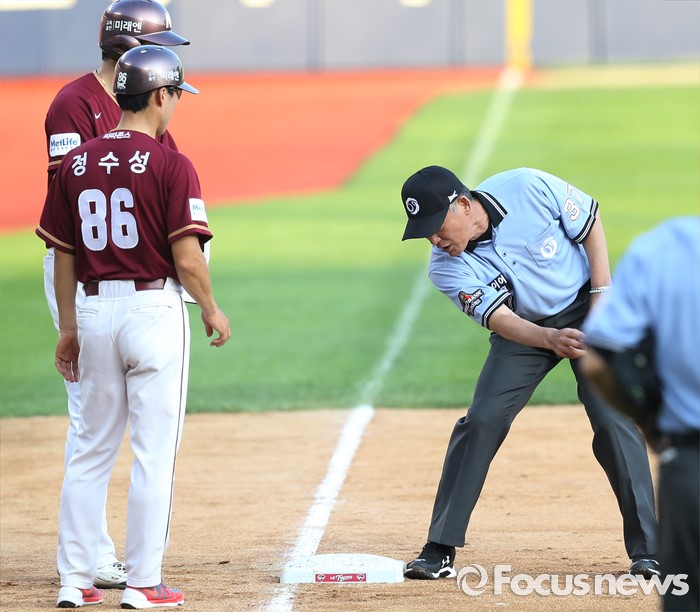 (서울=포커스뉴스) 26일 서울 잠실구장에서 열린 2016 프로야구 넥센-LG 경기 8회초, 김병주 3루심이 3루주자 임병욱의 2루 공과 판정에 대해 설명하고 있다.