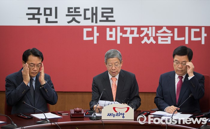 (서울=포커스뉴스) 김희옥(가운데) 새누리당 혁신비대위원장과 정진석(왼쪽) 원내대표, 김광림 정책위의장이 27일 오전 서울 여의도 당사에서 열린 혁신비상대책위원회 회의에 참석해 논의하고 있다.