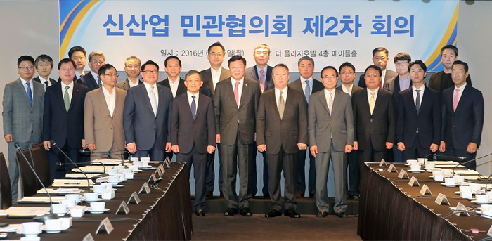 이날 회의에는 박용만 대한상공회의소 회장, 김준경 KDI 원장, 유병규 KIET 원장, 최원식 맥킨지 서울사무소 대표, 한상원 한앤컴퍼니 사장, 이주현 산업융합 옴부즈만, 김상헌 네이버 대표, 구자균 LG산전 회장, 김영민 SM엔터테인먼트 대표, 권오현 삼성전자 부회장, 이관순 한미약품 사장, 정 준 벤처기업협회장, 남학현 아이센스 사장을 비롯한 컨설팅, 거시‧인문사회, 신산업 분야 전문가와 대‧중소‧벤처기업 대표 등 신산업 민관협의회 위원 30여명이 참석했다. <사진제공=산업통상자원부>