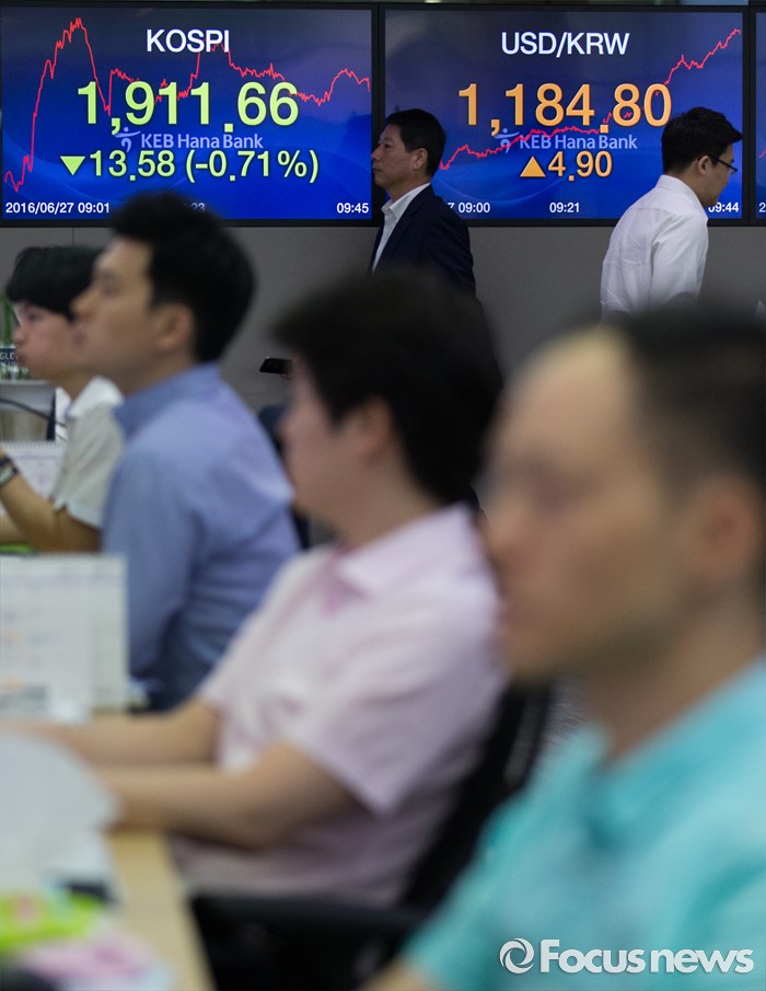 (서울=포커스뉴스) 브렉시트(영국 EU 탈퇴) 충격이 지속되고 있는 27일 오전 서울 중구 명동 KEB 하나은행 딜링룸에서 딜러들이 업무를 보고 있다.코스피는 전 거래일보다 23.39(1.21%) 포인트 하락한 1901.85로, 코스닥은 전 거래일보다 17.95(2.77%) 포인트 하락한 629.21에 시작했다. 원달러 환율은 5.6원 내린 1,174.3원으로 개장했다.
