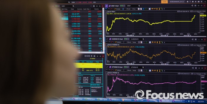 (서울=포커스뉴스) 브렉시트(영국 EU 탈퇴) 충격이 지속되고 있는 27일 오전 서울 중구 명동 KEB 하나은행 딜링룸에서 딜러들이 업무를 보고 있다.코스피는 전 거래일보다 23.39(1.21%) 포인트 하락한 1901.85로, 코스닥은 전 거래일보다 17.95(2.77%) 포인트 하락한 629.21에 시작했다. 원달러 환율은 5.6원 내린 1,174.3원으로 개장했다.