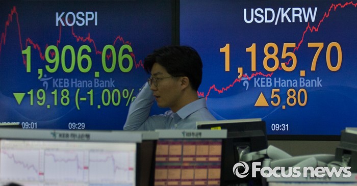 (서울=포커스뉴스) 브렉시트(영국 EU 탈퇴) 충격이 지속되고 있는 27일 오전 서울 중구 명동 KEB 하나은행 딜링룸에서 딜러들이 업무를 보고 있다.코스피는 전 거래일보다 23.39(1.21%) 포인트 하락한 1901.85로, 코스닥은 전 거래일보다 17.95(2.77%) 포인트 하락한 629.21에 시작했다. 원달러 환율은 5.6원 내린 1,174.3원으로 개장했다.