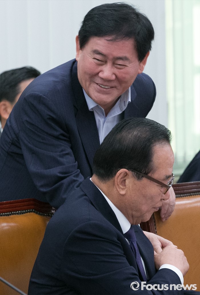 (서울=포커스뉴스) 27일 오전 서울 여의도 국회에서 열린 외교통일위원회 전체회의에 참석한 서청원(오른쪽), 최경환 새누리당 의원이 인사하고 있다.