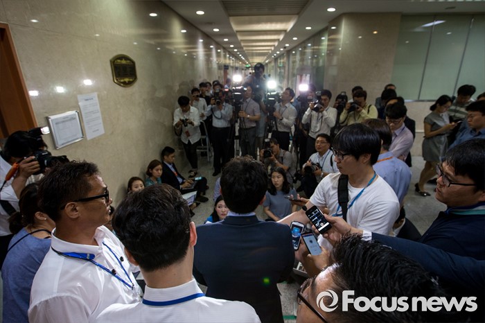 (서울=포커스뉴스) 김용태 새누리당 의원이 27일 오전 서울 여의도 국회에서 오는 8월 9일에 열리는 차기 전당대회 당 대표 경선 출마를 선언을 마친 뒤 취재진 질문에 답하고 있다.