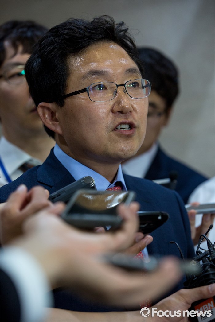 (서울=포커스뉴스) 김용태 새누리당 의원이 27일 오전 서울 여의도 국회에서 오는 8월 9일에 열리는 차기 전당대회 당 대표 경선 출마를 선언을 마친 뒤 취재진 질문에 답하고 있다.