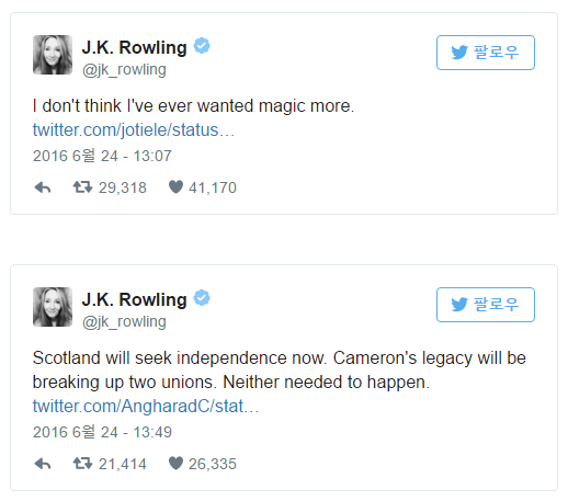 유명 판타지 소설 '해리 포터' 시리즈의 작가인 조앤 K 롤링은 브렉시트(영국의 EU 탈퇴) 확정 뒤 트위터를 통해 "잘가, 영국. 이토록 마법을 원했던 적이 없었다. 이제 스코틀랜드는 독립에 나설 것이고, 데이비드 캐머런 총리는 영국을 둘로 쪼개는 유산을 남겼다. 그 어떤 것도 일어날 필요 없었다"고 심경을 밝혔다.(너츠포드/영국=게티/포커스뉴스) 구멍난 유럽기. 2016.06.24 ⓒ게티이미지/이매진스 영국 유명 작가 조앤 K 롤링이 트위트를 통해 브렉시트 반대 입장을 표명했다. <사진출처=조앤 K 롤링 트위터>