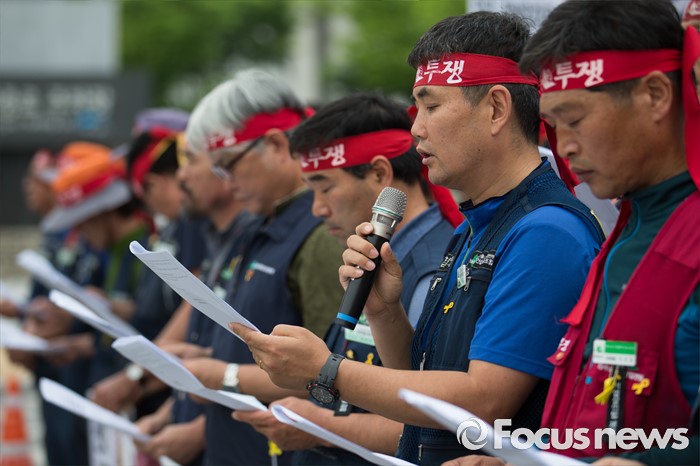 (서울=포커스뉴스) 전국건설노동조합 조합원들이 27일 오전 서울 종로구 정부서울청사 앞에서 7.6 총파업 총력투쟁을 선포하는 기자회견문을 낭독하고 있다.