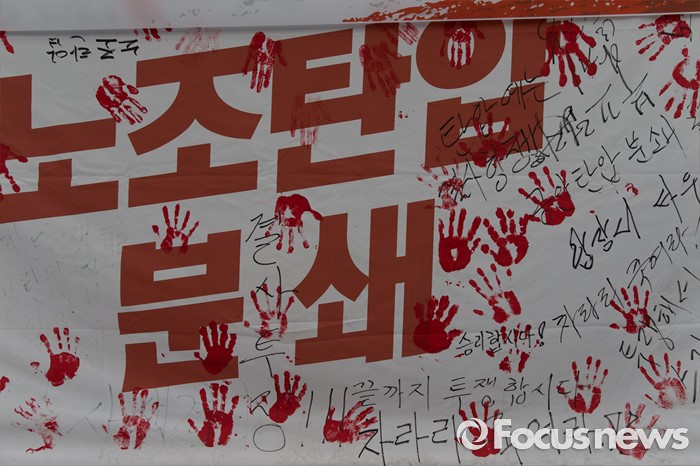 (서울=포커스뉴스) 27일 오전 서울 종로구 정부서울청사 앞에 7.6 총파업 총력투쟁을 선포하는 현수막에 전국건설노동조합 노조원들의 손바닥 도장이 찍혀있다.