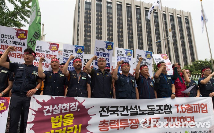 (서울=포커스뉴스) 전국건설노동조합 조합원들이 27일 오전 서울 종로구 정부서울청사 앞에서 7.6 총파업 총력투쟁을 선포하는 기자회견을 하고 있다.