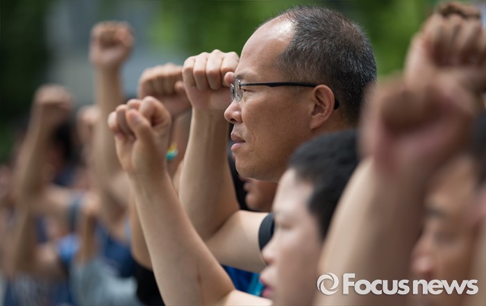 (서울=포커스뉴스) 전국공무원노동조합 조합원들이 27일 오전 서울 종로구 정부서울청사 앞에서 지도부 단식농성 투쟁 기자회견 중 성과퇴출제 폐지, 공무원법 개악 저지 촉구하는 구호를 외치고 있다.