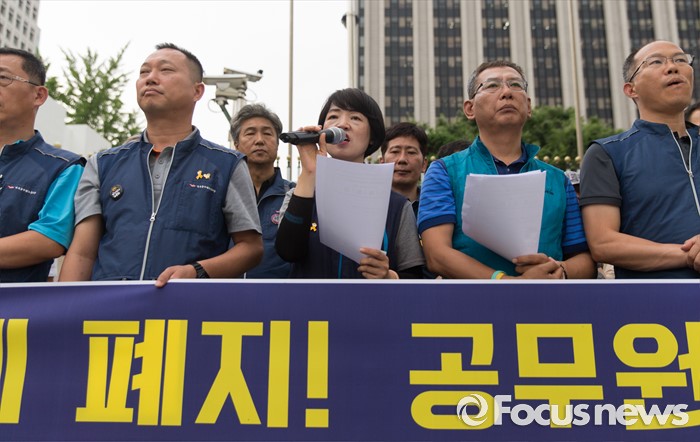 (서울=포커스뉴스) 전국공무원노동조합 조합원들이 27일 오전 서울 종로구 정부서울청사 앞에서 성과퇴출제 폐지, 공무원법 개악 저지 촉구 지도부 단식농성 투쟁 기자회견을 하고 있다.