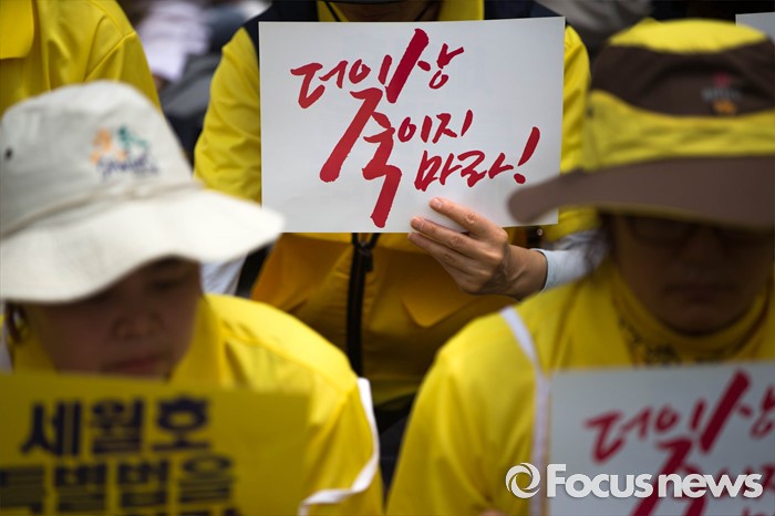 (서울=포커스뉴스) 27일 오후 서울 종로구 청운효자동주민센터 앞에서 416 가족협의회와 416 연대 관계자들이 세월호 특조위 강제해산과 박근혜 정부를 규탄하는 기자회견을 하고 있다.