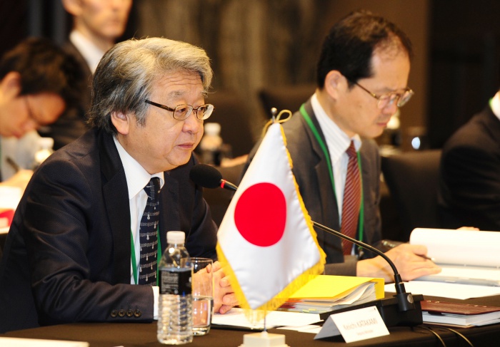 (서울=포커스뉴스) 나가미네 야수마사(Katakami Keiichi) 일본 외무성 경제담당 외무심의관이 27일 서울 동대문 메리어트호텔 그랜드볼룸에서 열린 한중일 FTA 10차 협상 수석대표회의에 참석하고 있다. <사진제공=산업통상자원부>