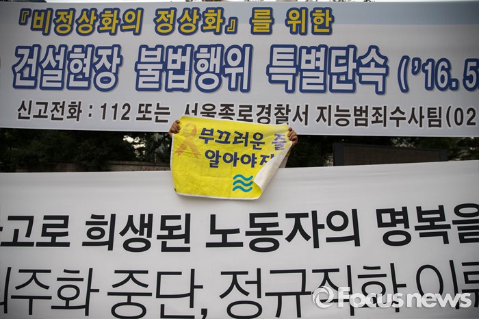 (서울=포커스뉴스) 27일 오후 서울 종로구 정부서울청사 앞에 세월호 관계자들이 세월호 특별법 개정 및 선체 인양을 촉구하는 기자회견을 하기 위해 청운동주민센터 앞으로 이동하고 있다.