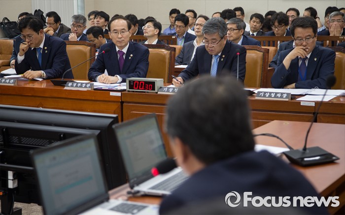 (서울=포커스뉴스) 윤성규(왼쪽 두번째) 환경부 장관이 27일 오후 서울 여의도 국회에서 열린 환경노동위원회 전체회의에서 조원진 새누리당 의원으로부터 질문 받고 있다.