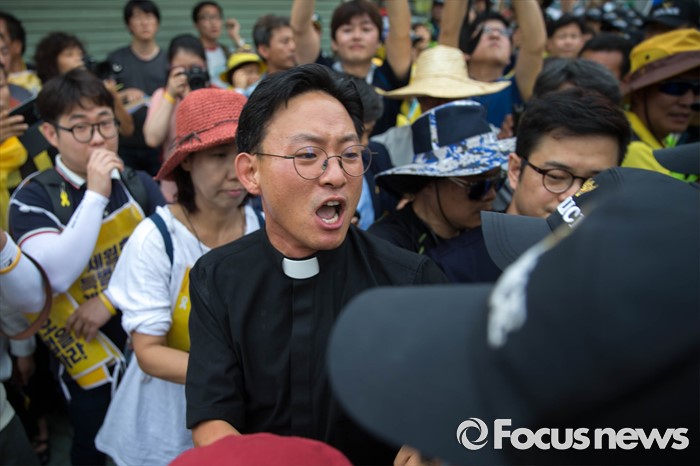 (서울=포커스뉴스) 27일 오후 서울 종로구 정부서울청사 앞에 세월호 관계자들이 세월호 특별법 개정 및 선체 인양을 촉구하는 기자회견을 하기 위해 청운동주민센터 앞으로 이동하던 중 경찰 병력에 의해 길이 가로막히자 행진에 참석한 한 신부가 거칠게 항의하고 있다.