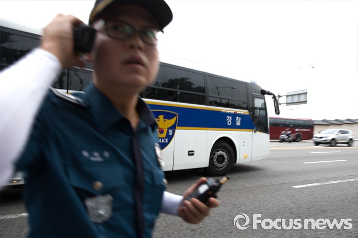 (서울=포커스뉴스) 27일 오후 서울 종로구 정부서울청사 앞에서 세월호 관련 기자회견을 앞두고 있는 관계자들의 돗자리를 압수 보관한 경찰버스가 세월호 관계자들의 거친 항의에 급히 자리를 옮기고 있다.