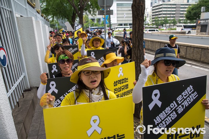 (서울=포커스뉴스) 27일 오후 서울 종로구 정부서울청사 앞에 세월호 관계자들이 세월호 특별법 개정 및 선체 인양을 촉구하는 기자회견을 하기 위해 청운동주민센터 앞으로 이동하고 있다.
