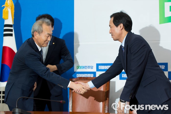 (서울=포커스뉴스) 우상호(오른쪽) 더불어민주당 원내대표가 27일 오후 서울 여의도 국회에서 이석태 세월호특별조사위원회 위원장과 면담에 앞서 악수 하고 있다.