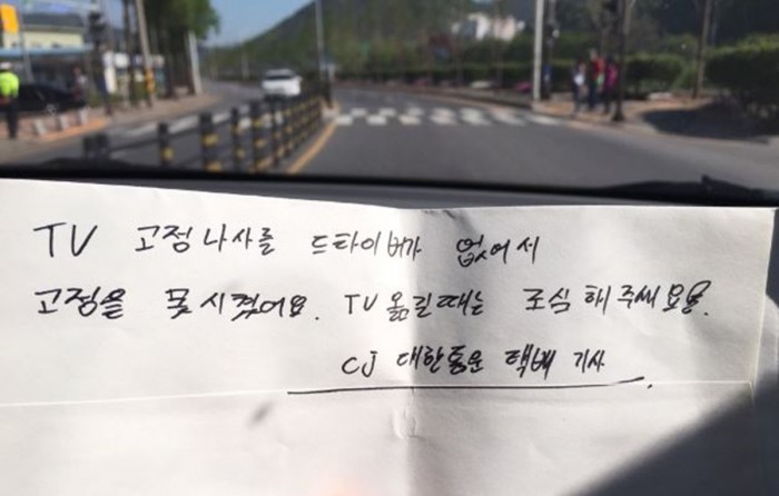 (서울=포커스뉴스) 혼자 사는 할머니를 위해 TV를 조립해준 친절한 CJ대한통운 택배기사의 쪽지가 온라인상에서 화제다.