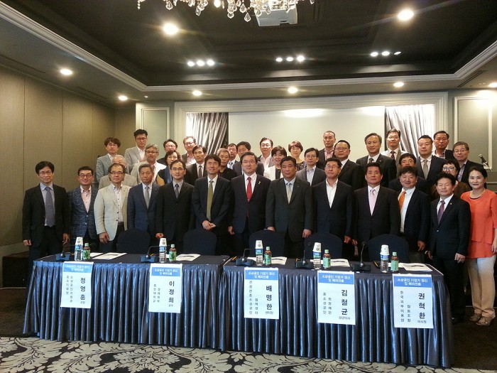 특히 정영훈 소상공인지원과장은 "관련부처별 통합 플랫폼을 구축하고 기존 국가에 이란 등 더 많은 국가의 진출 인큐베이터에도 지원방안을 강구하고 있다"며 "소상공인의 해외진출 성공을 이끌어낼 수 있도록 다각적인지원방법을 모색할 생각을 갖고 있다"고 말했다.'소상공인 기업가 정신 및 해외 진출' 포럼 참석자들이 기념촬영하고 있다.<사진제공=소상공인연합회>
