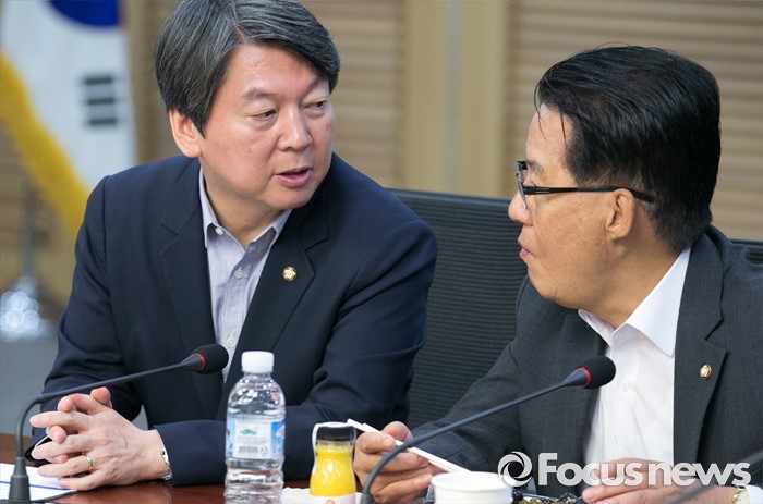 (서울=포커스뉴스) 28일 오전 서울 여의도 국회 의원회관에서 열린 국민의당 20차 정책역량강화 워크숍에 참석한 안철수(왼쪽) 상임공동대표와 박지원 원내대표가 대화하고 있다.
