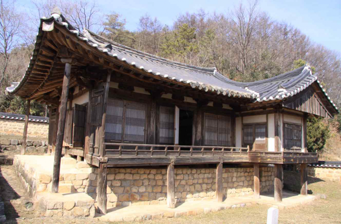 건물의 평면은 전체적으로 정면 4칸, 측면 4칸의 '고무래 정(丁)'자 형이다. 정면 좌측 3칸은 대청으로 꾸몄으며 그 우측으로 온돌방 3칸과 누마루 1칸을 세로로 길게 두었다. 건물 주위에는 흙과 돌로 만든 토석담장을 둘렀고 전면 담장 좌측에는 기둥이 네 개인 사주문(四柱門)을 세워 정자로 출입할 수 있도록 했다.