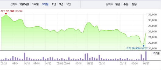 위메이드는 이날 “상하이 카잉네트워크 테크놀로지(Shanghai Kaiying Network Technology Co., Ltd.)와 중국 내 ‘미르의전설2’ 모바일·웹게임 라이센스 계약을 체결했다”며 “계약금액은 300억원이고 계약기간은 3년”이라고 공시했다.주가흐름<사진출처=네이버 캡쳐>