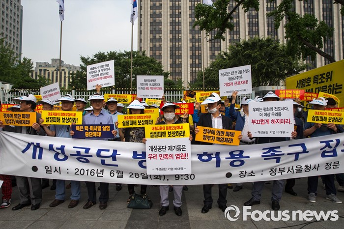 (서울=포커스뉴스) 28일 오전 서울 종로구 정부서울청사 앞에서 개성공단 입주기업 비대위 관계자들이 방북 승인을 촉구하는 집회를 하고 있다.