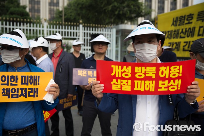 (서울=포커스뉴스) 28일 오전 서울 종로구 정부서울청사 앞에서 개성공단 입주기업 비대위 관계자들이 방북 승인을 촉구하는 집회를 하고 있다.
