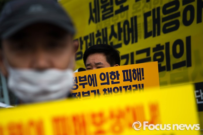 (서울=포커스뉴스) 28일 오전 서울 종로구 정부서울청사 앞에서 개성공단 입주기업 비대위 관계자들이 방북 승인을 촉구하는 집회를 하고 있다.