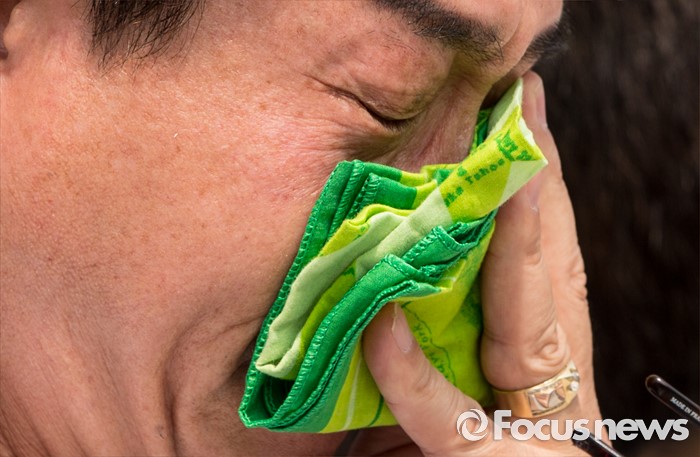 (서울=포커스뉴스) 28일 오전 서울행정법원 앞에서 열린 세월호 희생 기간제교사 순직 인정 촉구 소송 기자회견에 참석한 故 김초원 교사의 부친 성욱씨가 순직 인정을 촉구하는 발언 후 눈물을 훔치고 있다.