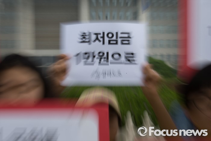(서울=포커스뉴스) 28일 오전 서울 여의도 국회 앞에서 알바노조 조합원들이 최저임금 1만원 요구 용윤신 사무국장 단식농성 시작 기자회견을 하고 있다.