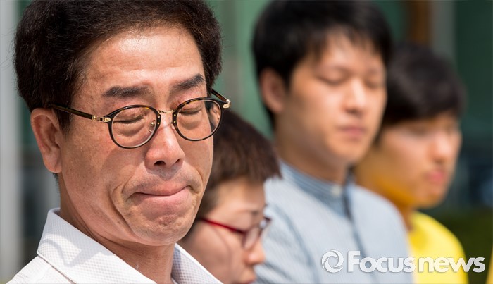 (서울=포커스뉴스) 28일 오전 서울행정법원 앞에서 열린 세월호 희생 기간제교사 순직 인정 촉구 소송 기자회견에 참석한 故 김초원 교사의 부친 성욱씨가 순직 인정을 촉구하는 발언 후 슬픔에 잠겨 있다.