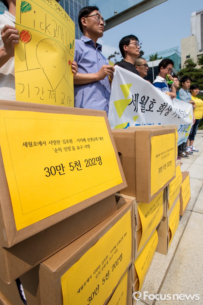 (서울=포커스뉴스) 28일 오전 서울행정법원 앞에서 세월호 희생 기간제교사 순직인정촉구대책위 회원들이 순직 인정 촉구 소송 기자회견을 갖고 있다.