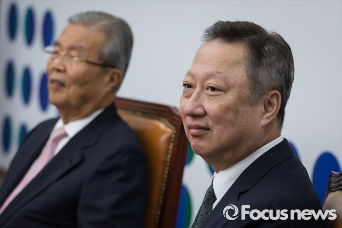 (서울=포커스뉴스) 박용만(오른쪽) 대한상공회의소 회장이 28일 오전 서울 여의도 국회에서 김종인 더불어민주당 비상대책위원회 대표를 만나고 있다.
