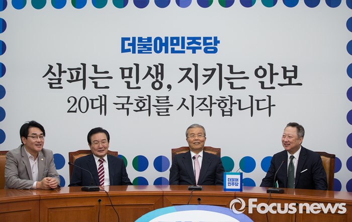 (서울=포커스뉴스) 김종인(왼쪽 세번째) 더불어민주당 비상대책위원회 대표와 변재일(왼쪽 두번째) 정책위의장이 28일 오전 서울 여의도 국회에서 박용만(오른쪽) 대한상공회의소 회장을 접견하고 있다.