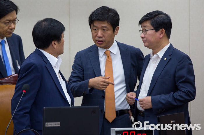 (서울=포커스뉴스) 이진복(왼쪽) 국회 정무위원회 위원장과 전해철(오른쪽) 더불어민주당 간사, 유의동 새누리당 간사가 28일 오전 서울 여의도 국회에서 열린 정무위원회에 참석해 의견을 나누고 있다.