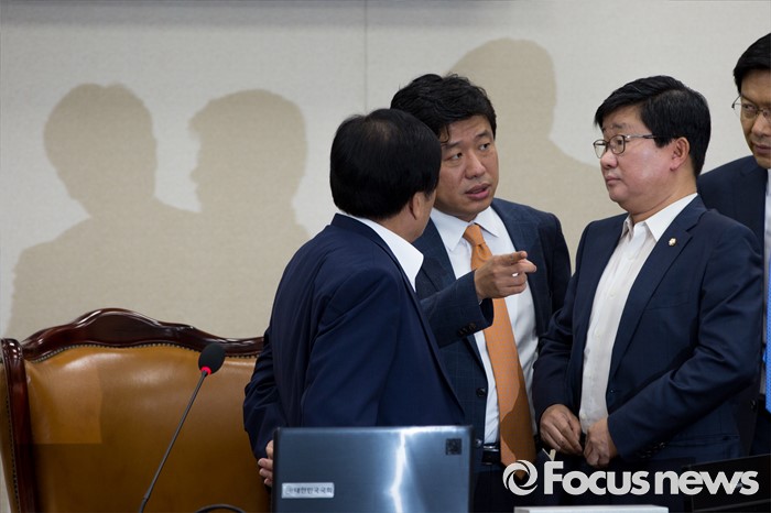 (서울=포커스뉴스) 이진복(왼쪽) 국회 정무위원회 위원장과 전해철(오른쪽) 더불어민주당 간사, 유의동 새누리당 간사가 28일 오전 서울 여의도 국회에서 열린 정무위원회에 참석해 의견을 나누고 있다.