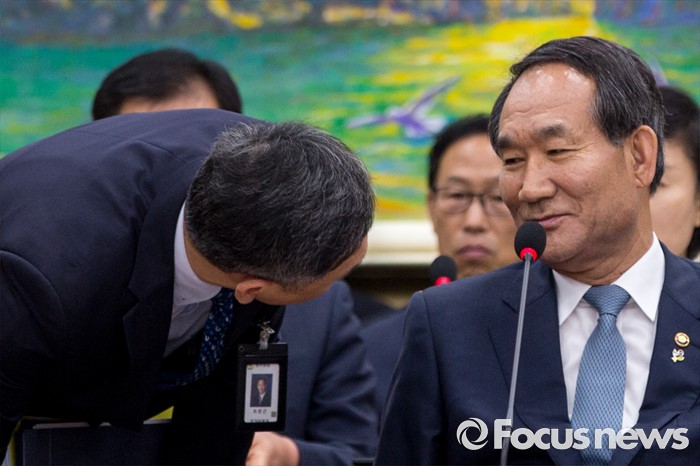 (서울=포커스뉴스) 박승춘(오른쪽) 국가보훈처장이 28일 오전 서울 여의도 국회에서 열린 정무위원회에 참석해 최완근 국가보훈처 차장과 대화를 나누고 있다.