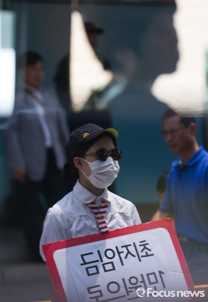 (서울=포커스뉴스) 28일 오전 서울 마포구 한국경영자총연합회 회관 앞에서 알바노조 조합원들이 10년 연속 최저임금 동결을 주장하는 경총에 항의방문 하고 있다.