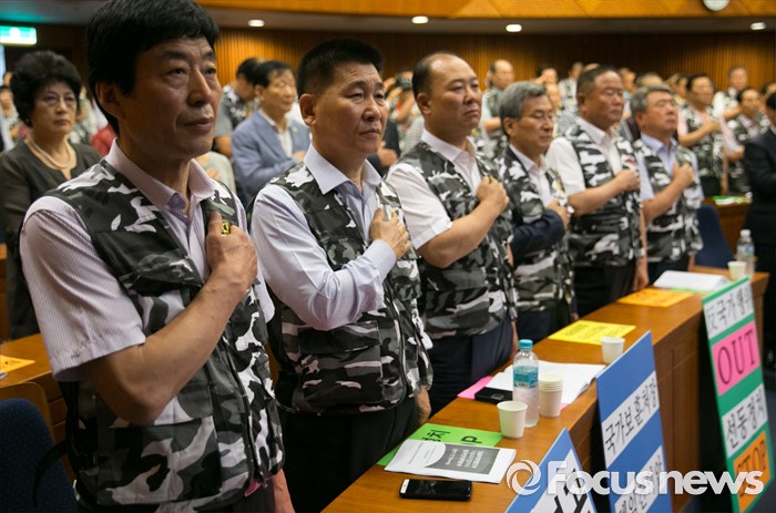 (서울=포커스뉴스) 28일 오전 서울 여의도 국회 헌정기념관에서 열린 '임을 위한 행진곡' 기념곡 지정저지 범국민대책본부 출범식 및 결의대회에 참석한 관련단체 회원 및 참석자들이 국기에 대한 경례를 하고 있다.