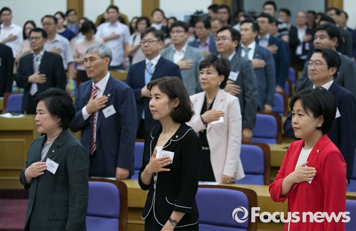 (서울=포커스뉴스) 28일 오후 서울 여의도 국회 의원회관에서 열린 4차 산업혁명포럼 창립총회에 참석한 송희경(앞줄 오른쪽부터) 새누리당 의원, 박경미 더불어민주당 의원, 신용현 국민의당 의원 등 의원 및 참석자들이 국기에 대한 경례를 하고 있다. 이날 창립한 포럼은 여야 3당 비례대표 1번인 송희경 새누리당 의원, 박경미 더불어민주당 의원, 신용현 국민의당 의원을 주축으로 구성된 포럼이다.