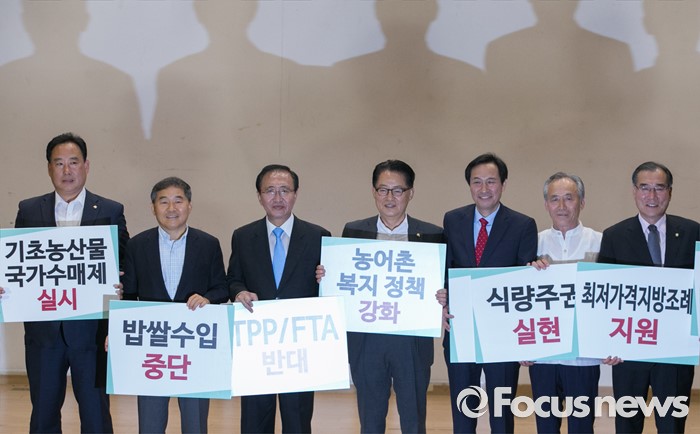 (서울=포커스뉴스) 28일 오후 서울 여의도 국회 의원회관에서 열린 20대 국회가 꼭 해야 할 농업개혁 과제 정책토론회에 참석한 우상호(오른쪽 세번째부터) 더불어민주당 원내대표, 박지원 국민의당 원내대표, 노회찬 정의당 원내대표 등 의원 및 참석자들이 피켓을 들고 기념촬영을 하고 있다.