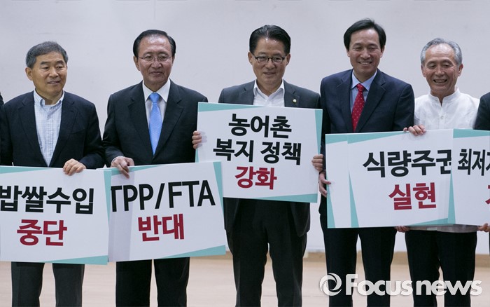 (서울=포커스뉴스) 28일 오후 서울 여의도 국회 의원회관에서 열린 20대 국회가 꼭 해야 할 농업개혁 과제 정책토론회에 참석한 우상호(오른쪽 세번째부터) 더불어민주당 원내대표, 박지원 국민의당 원내대표, 노회찬 정의당 원내대표 등 의원 및 참석자들이 피켓을 들고 기념촬영을 하고 있다.