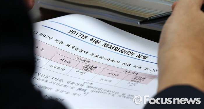 (세종=포커스뉴스) 28일 오후 세종시 정부세종청사 고용노동부 최저임금위원회 전원히의실에서 열린 최저임금위원회 제7차 전원회의에서 위원이 2017년 적용 최저임금안을 살피고 있다.