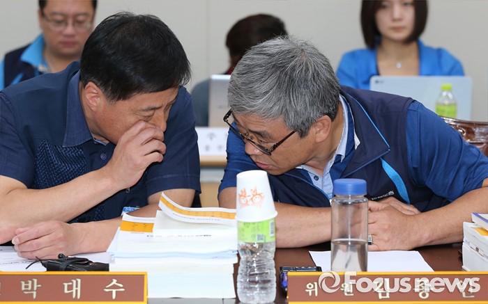 (세종=포커스뉴스) 28일 오후 세종시 정부세종청사 고용노동부 최저임금위원회 전원히의실에서 열린 최저임금위원회 제7차 전원회의에서 박대수, 김종인 위원이 대화하고 있다.