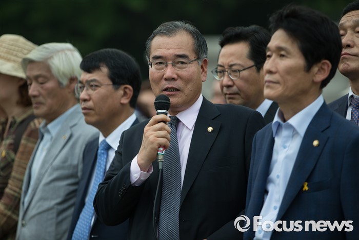 (서울=포커스뉴스) 이개호 더불어민주당 의원이 416가족협의회, 4월16의약속국민연대와 함께 28일 오후 서울 여의도 국회 앞에서 20대 국회, 6월 임시국회에 특별법 개정을 촉구하는 기자회견을 하고 있다.