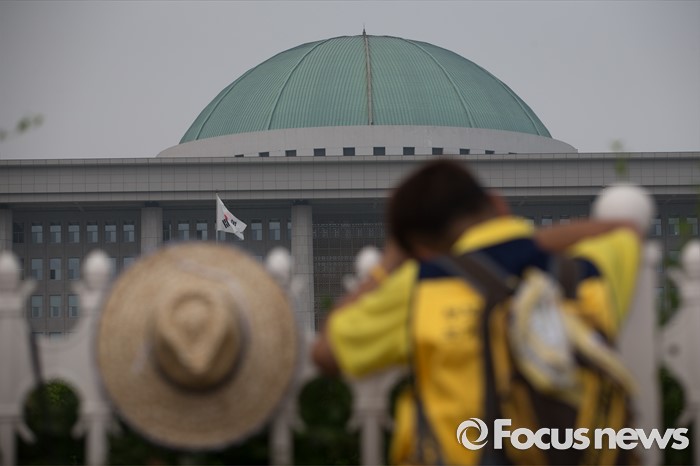 (서울=포커스뉴스) 416가족협의회와 4월16의약속국민연대가 28일 오후 서울 여의도 국회 앞에서 '20대 국회 6월 임시국회에 특별법 개정 촉구' 기자회견을 가졌다. 한 유가족이 국회 울타리 앞에서 슬픔에 잠겨 있다.